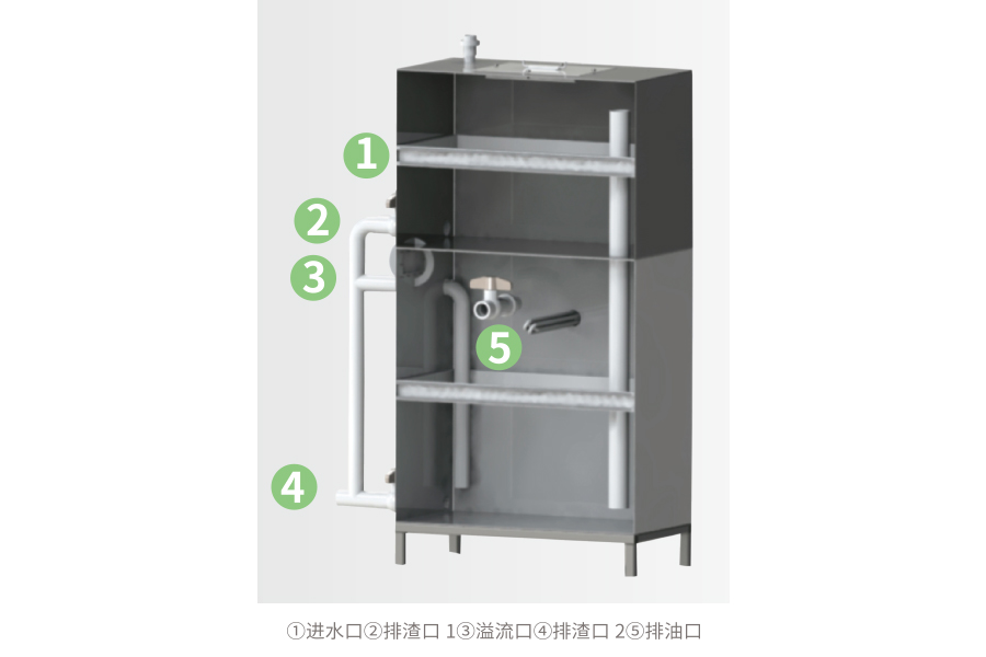 污水泵將污水泵入“進(jìn)水口”,減慢污水的流動速度, 增加油水的上升時(shí)間,多余的水從“溢流口”流走, 廢氣油脂被隔離在箱體里,待油層達(dá)到一定的厚度, 就可實(shí)現(xiàn)油水的明顯分離。